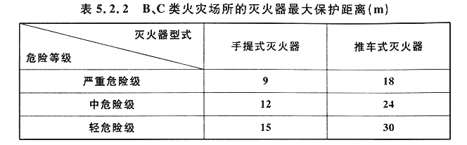 設(shè)置在B、C類火災(zāi)場(chǎng)所的滅火器,其最大保護(hù)距離應(yīng)符合表5.2.2的規(guī)定。
