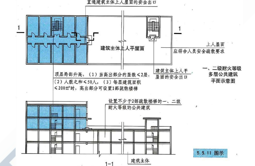 (3)一、二級耐火等級多層公共建筑,當設置不少于2部疏散樓梯且頂層局部升高層數(shù)不超過2層、人數(shù)之和不超過50人、每層建筑面積不大于200㎡時,該局部高出部位可設置一部與下部主體建筑樓梯間直接連通的疏散樓梯,但至少應另設置一個直通主體建筑上人平屋面的安全出口,該上人屋面應符合人員安全疏散要求。